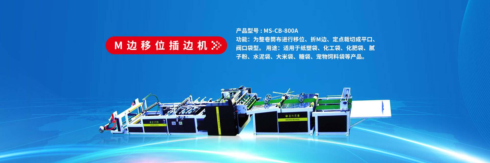 功能:為整卷筒布進(jìn)行移位、折M邊、定點裁切成平口、閥口袋型。